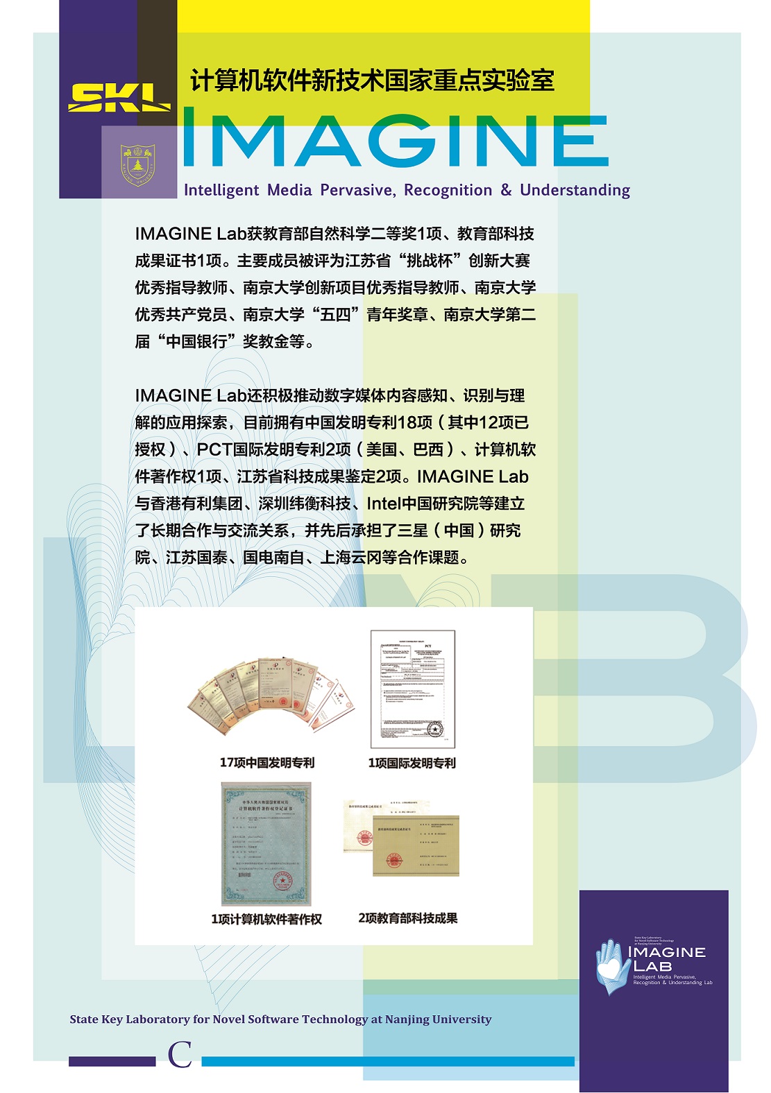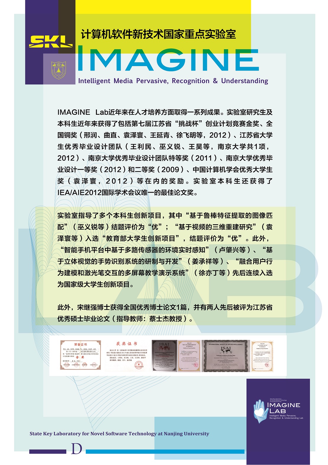 IMAGINE (Intelligent Media pervAsive, recoGnItion & uNdErstanding) is a lab established at National Key Lab for Novel Software and Technology at Nanjing University, China. The targets of IMAGINE lab include both algorithm/theory exploration and real-life systems developing. We believe automatic understanding and visualizing the content of everyday real (big) media data stream is one of the fundamental challenges in computer science, and significant advances will be made over the next few years by combining the state of the art knowledge representations and machine learning or statistical modeling techniques on big multimeida data from Internet.